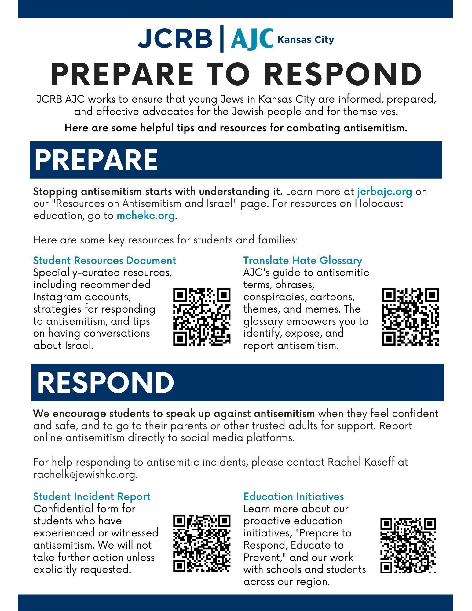 - Conversations and Training: JCRB|AJC can offer training about contemporary antisemitism to Jewish students and Jewish student groups. Please contact rachelk@jewishkc.org for more information.